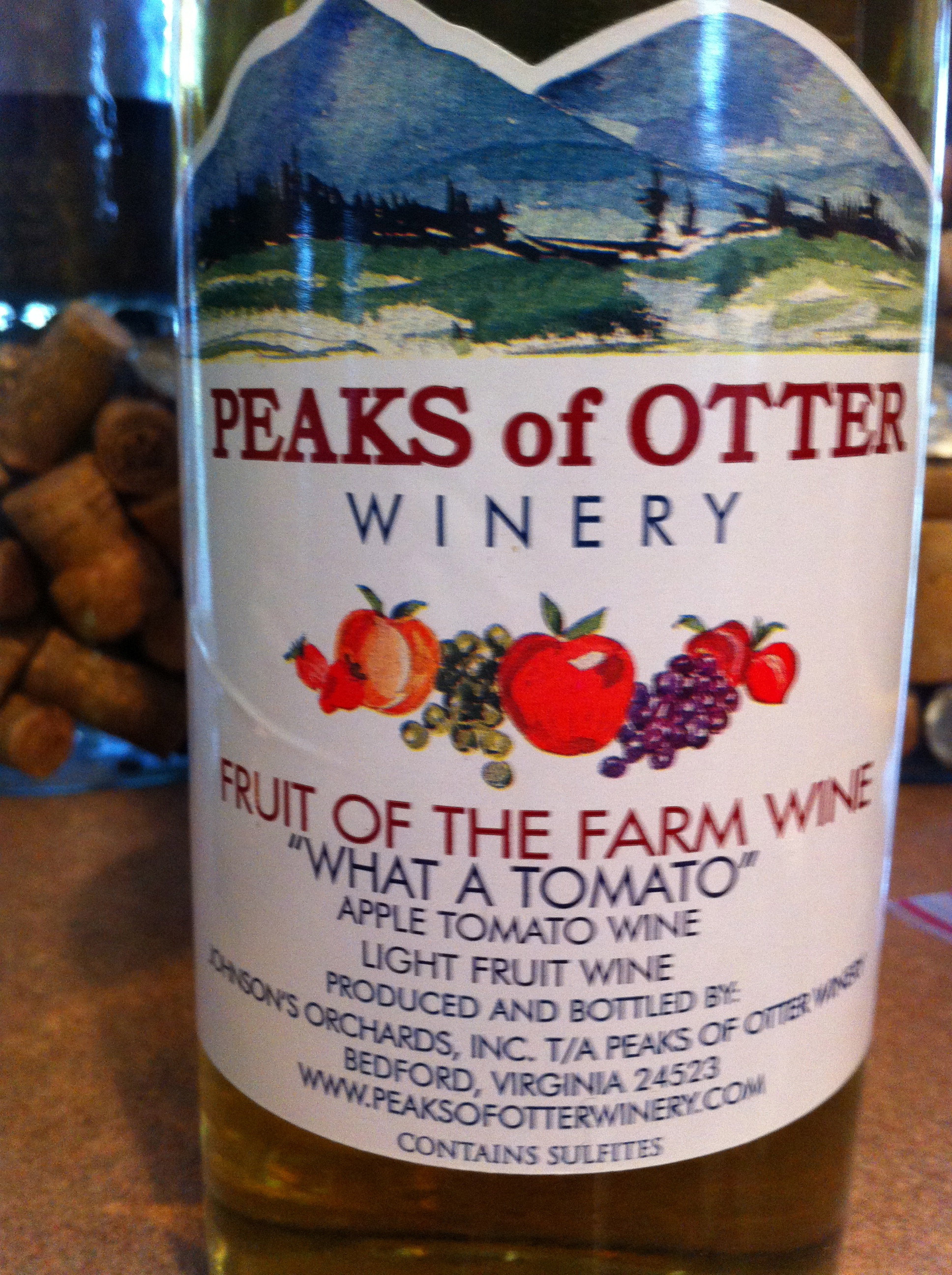 The label claims it is a tomato and apple wine, made in Virginia with no alcohol content info. In the glass, very dark yellow, reminiscent of well-oaked chardonnay or a Sauternes. On the nose, a very distinct tomato and vegetal note are intriguing to me. I’m also getting a very floral note on the back side of the smell. On the initial palate……hmmmma – a certain unctuosness that gives up some slightly unbalanced flavors of tomato and apple, yet somewhat green and underripe. There is no acidity and certainly no sign of tannin.