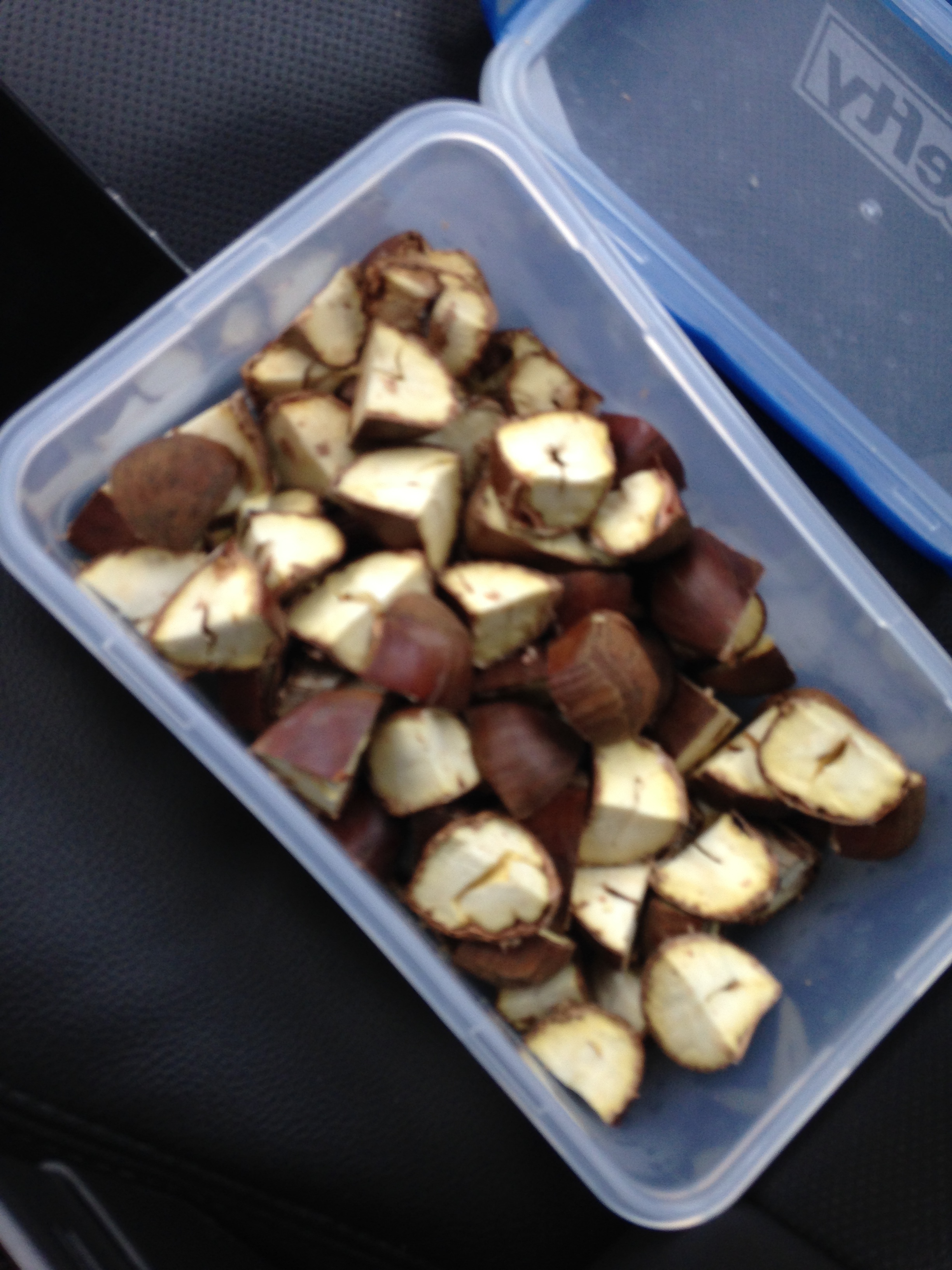 Raw chestnuts, quartered for ease of peeling