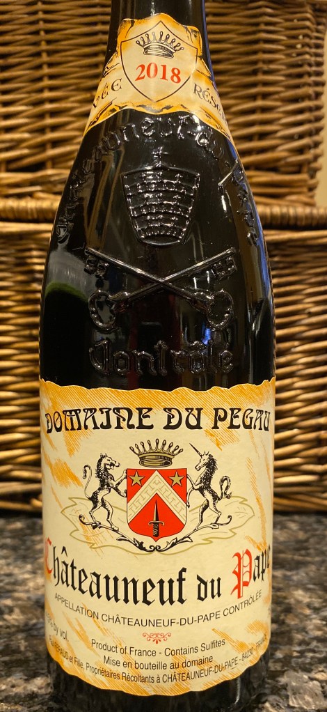 I love a CDP, as does our virtual tasting group but this one was not a crowd pleaser.  Medium ruby colored it had pronounced aromas of game (road kill), tomato, sawdust, violets, herbs de Provence and baked/stewed blueberry.  The palate was dry with well integrated medium (+) tannins, low acidity and a medium body.  Flavors of game, stewed blueberry, charcoal, smoke, and a waxy component were noted.  The finish was decently long for this 91 point wine.  I scored it 15 points on our grading scale and for $50 it only gets 3 stars from me.  The pro’s went as high as 96 points for this old vine Grenache blended with Syrah and Mourvedre.  I would drink this angular wine with stews or perhaps a venison roast.  Cellar wise- it should go till 2030.  Salut…..