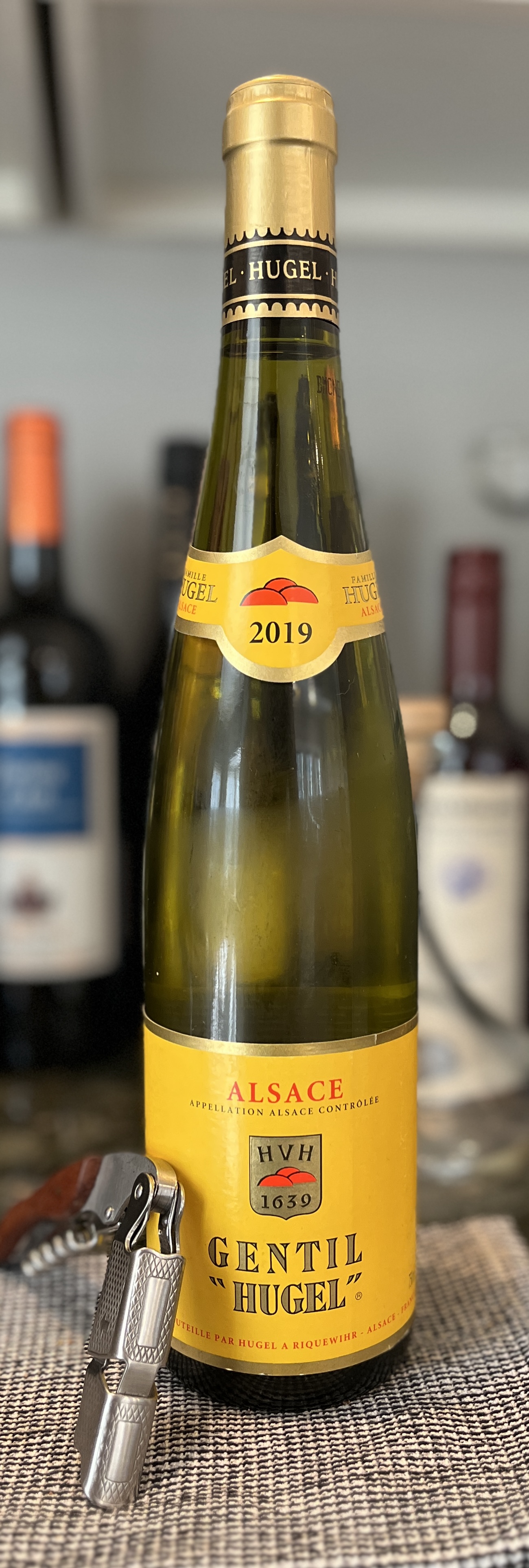 Pale lemon colored with medium viscosity legs (13.5% ABV). The nose has peach, lemon, lime curd, papaya, pineapple, ginger, white flowers, orange blossom and grapefruit. Quite a layered set of aromas! The palate is dry with medium acidity and a medium body. The exotic and citrus aromas are confirmed on the palate with a touch of bitterness but no ginger. The florals are feint but present. I start to get lychee on the mid palate from the Gewürztraminer. This wine also blends in Sylvaner, Pinot Gris, Riesling and Muscat- the Noble grapes of Alsace. It is a refreshing yet multi-layered wine that has a crisp, medium length finish. It will go beautifully with our garlic Scampi but I would also pair it with salads, grilled salmon or some charcoal chicken. It’s well worth the $15 price point and gets 90 points and 5 stars from me. Stock up for summer y’all. Salut….